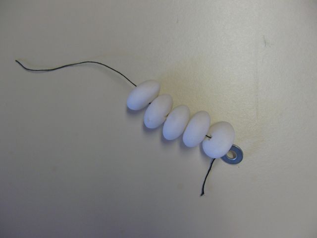 Next, tie a heavy washer or fishing sinker to the end of your thread, and thread about five mints along the line. Do this for each bottle. This will be the thread that wraps around the firing pin and keeps the Mentos from falling into the bottle before the pin is pulled. This is the "mint line."